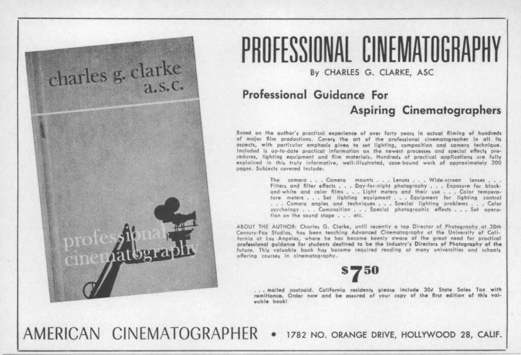 The only dependable resource was a few select books, and the above volume was one of the first I unearthed.  I never met Charles G. Clarke, ASC (1899-1983), but I sure do wish I did.  A four-time Oscar-nominee, he was one of the top men of the studio era.  Generosity with outsiders was not a valued trait during that time, and spreading information on the craft was generally frowned upon.  Yet, Clarke somehow found it within himself to provide a basic understanding of the tools and techniques without betraying any secrets.  His book was already twenty years old when I stumbled across it, and if it was in any way dated, I didn’t care.  I recall staying up all night devouring it.