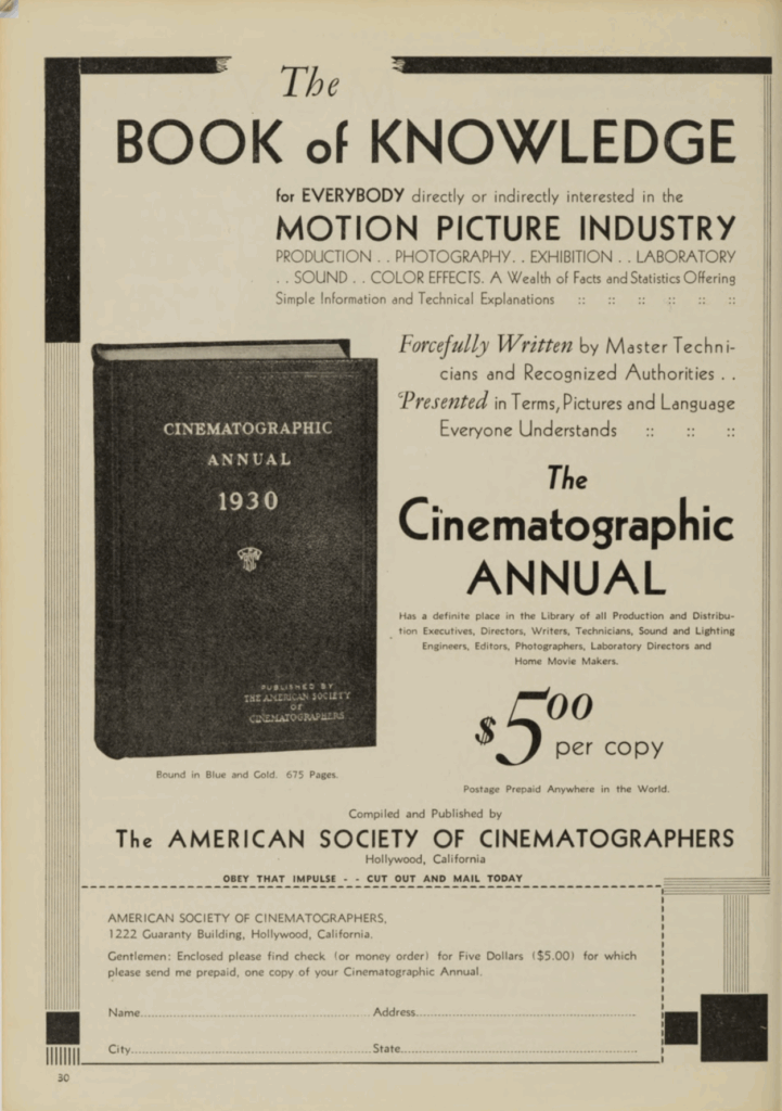 Prior to the arrival of Jackson Rose’s first ASC Manual in 1935, there was the Cinematographic Annual. Limited to two editions that were published by the ASC in 1930 and 1931, they contained an incredible body of knowledge. I can still recall my excitement when I stumbled over them early in my career. At nearly 700 pages each, they provided hours of fascinating reading that helped fill the many gaps in my passionate but mostly empty brain.