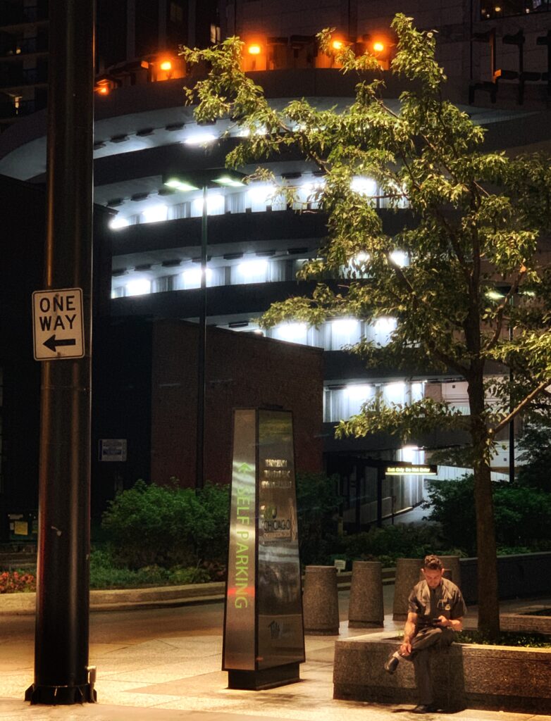 I’m always fascinated by what a photographer is thinking when they take a picture. When I look at an image, I instinctively form my own interpretation. In this one, I see a concrete and metal monster with bright red eyes towering over a small man, absorbed in his cellphone and unaware of the world around him, with a tree standing just behind him. Nature feels enclosed, while this concrete and metal monster with glowing red eyes devours the original jungle. Yet the man is distracted by the very technology he invented, using it to look away from everything surrounding him. It feels like a picture of decadence and irony, almost a Magritte vibe, like “The Empire of Light”, where the illumination is on the little man, while the world outside belongs to the majestic protagonist. It pushes your eyes to shift between the full image and the specific subject in the illuminated corner.