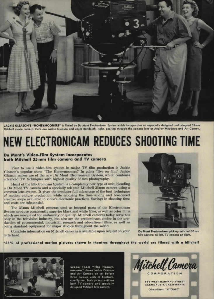 The end credits on those Honeymooners episodes carry an Electronicam notation, which is one of the few visible legacies of the system today.  British producer J. Arthur Rank briefly tried the system in the U.K. the following year but was dissatisfied with the results.  The real death blow came shortly thereafter.  Ampex’s 2‑inch quadruplex videotape recorder debuted in 1956, making it possible to record live video directly to tape for near‑instant playback and editing without the complexity and cost of a synchronized film camera.  Meeting the same end that all filmic technology eventually does, the Dumont Electronicam – revolutionary for a moment – became a victim of fast-moving progress.