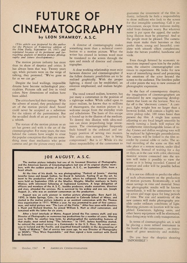 With that in mind, I refer you to an article from the October 1947 issue of American Cinematographer. Apparently, there was a trace of paranoia in the air back then, too. Fortunately, the great Leon Shamroy, ASC stepped up to share his thoughts. Pay special attention to the fourth from last paragraph and take note of his tone. Everything he expresses can be applied in some form to our situation today.