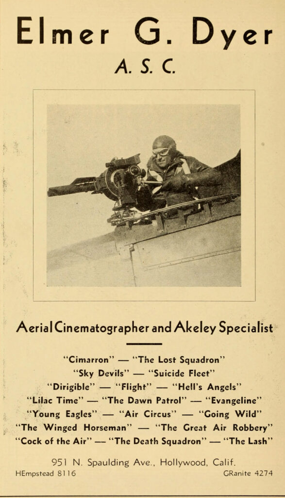We’ve long taken aerial cinematography for granted, but ninety years before Top Gun: Maverick ruled the skies, a daredevil cameraman took to the air in order to bring his own breathtaking images to moviegoers around the world. As the first to specialize in that sort of work, Elmer Dyer, ASC was a pioneer in the truest sense. Though his memory has been lost to the ages for the most part, the standard he set remains impressive.