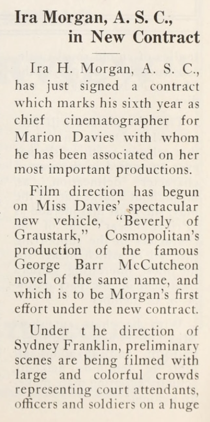Returning home, he teamed up with director King Vidor in 1919 for six highly-touted films starring the future consort of William Randolph Hearst, Marion Davies.  Over the following decades, he worked for a wide range of studios – Columbia, Cosmopolitan, MGM, Monogram, Paramount, Universal and Warner Bros.  Perhaps his best-known work is Charlie Chaplin’s Modern Times (1936), on which he collaborated with former Essanay colleague, Roland Totheroh, ASC.  While never an Oscar nominee or winner, Morgan was a solid cameraman who always got the job done in an appropriate and competent style.  Nonetheless, the Federal Security Agency of the U.S. Office of Education saw fit to give him a special citation for his photography of a film showing everything a machinist does in building a ship.
