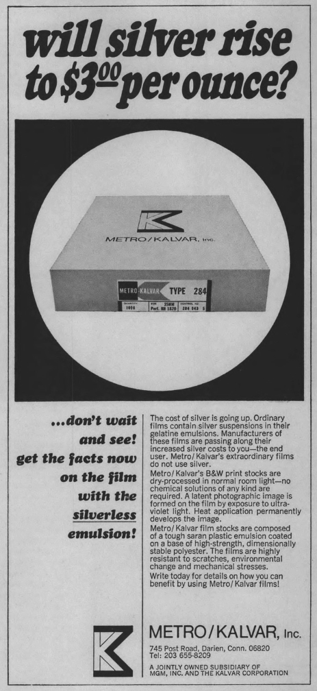 Interesting as it is, there’s a good reason why you’ve probably never heard of any of this.  Due to nagging technical and aesthetic issues, Kalvar never caught on with the film industry and was soon relegated to the dustbin of history.  Though it remains available today through special order, the shift to computerization of documents has further made vesicular film obsolete.