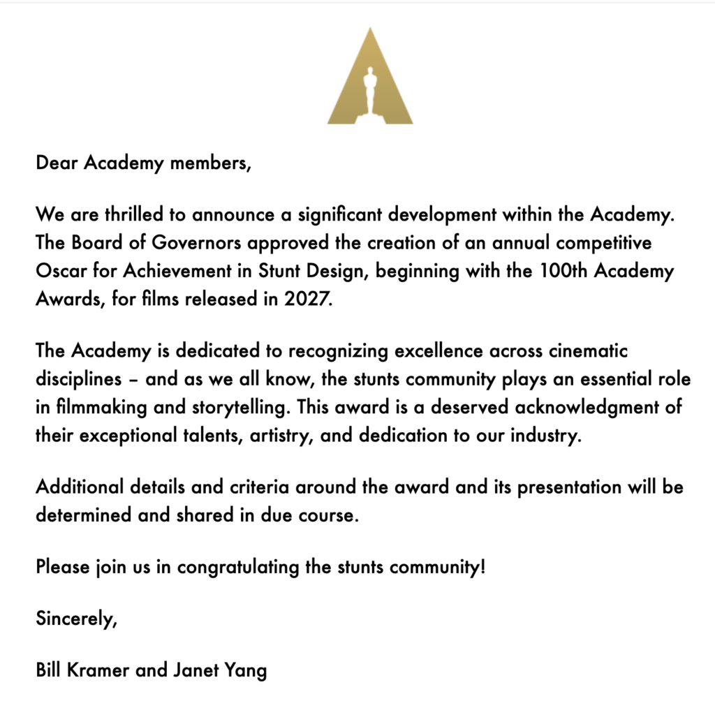 Nonetheless, it once again goes to show what persistence and passion can deliver. Congratulations to David Leitch and Chris O’Hara for leading the charge. I’m already excited to see who will be the first winner for Stunt Design at the 2028 ceremony!