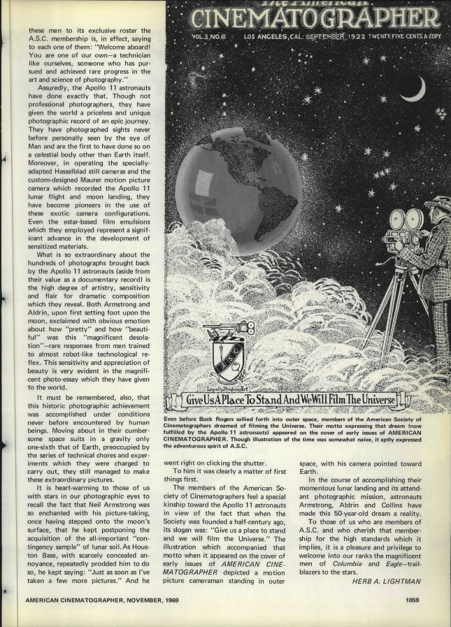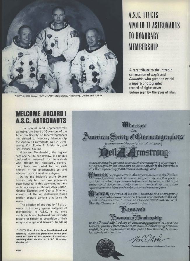 But the thrills weren’t left behind on the rocky surface of Tranquility Base. In recognition of their being the first humans to shoot motion pictures on a place not called Earth, upon returning home (along with teammate and Command Module Pilot, Michael Collins), the three were made Honorary Members of the ASC. As there had been only ten others so recognized before them, they were once again joining rare company. Aldrin is the last survivor and is still listed on our roster.