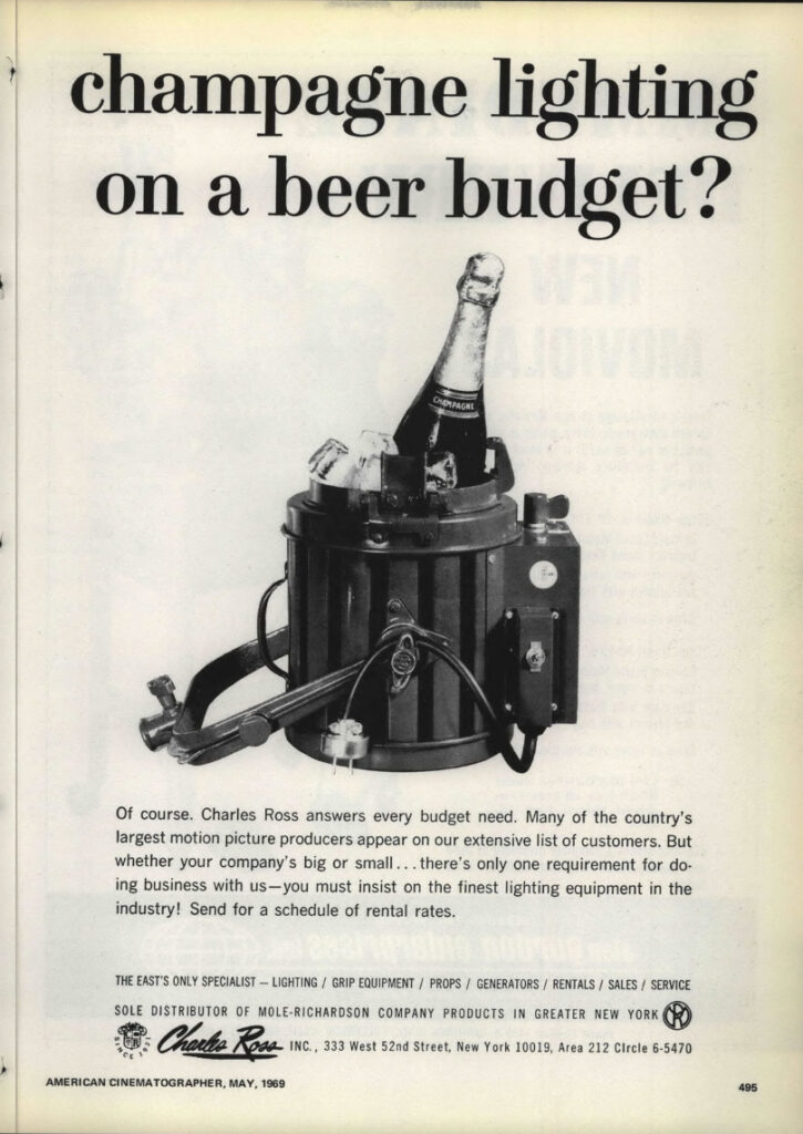 LED technology has quickly turned many of our formerly common lighting units into antiques.  Rather than toss them on the heap, this ad from the May 1969 issue of American Cinematographer suggests an interesting tack.  It’s a sad sight in its way, though no doubt will present its own reward given the right choice of beverage.