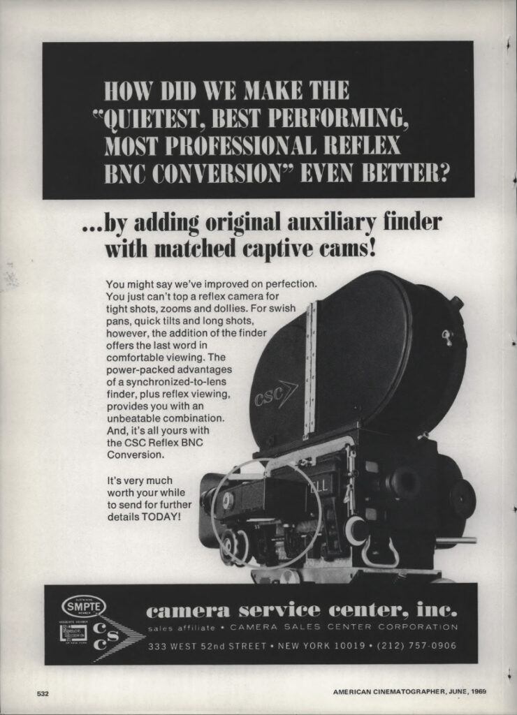 We all take reflex viewing systems for granted these days, but there once was a time when they were considered an amazing innovation. This ad, from the June 1969 issue of American Cinematographer, offers a perspective that had me scratching my head. With the pictured Mitchell BNC already reflex-modified, why would anyone retrofit it with an outdated, offset viewfinder?