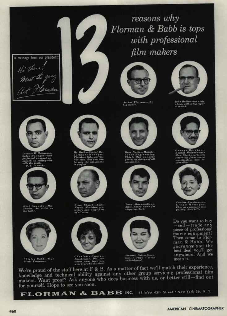 When I started my first job in the industry as a camera PA on a commercial in November of 1978, I had no idea what an important role the rental house he created with partner John Babb would soon play in my elementary education. F&B Ceco (acronym for Florman & Babb Camera Equipment Company) was a New York City institution for many years. As concerned an aspiring AC at the time, there were very – very – few outlets from which to learn. You could depend on only two sources of knowledge if you wanted to get ahead: working professionals (an almost impossible relationship to access unless you were born to one) and the generosity of staff members at equipment rental facilities.
