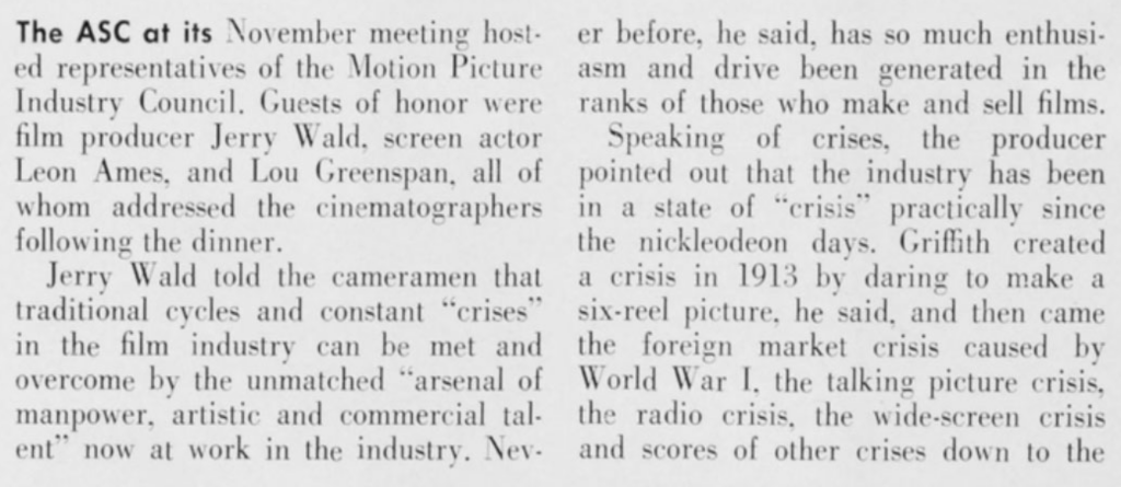 It’s no secret that the recent past has marked a particularly rough period for people who work in the motion picture industry.  To offer some perspective, here’s an article from the December 1957 issue of American Cinematographer.  I’m always banging on about how there’s nothing new under the cinematographic sun.  Apparently, the theory still holds true.