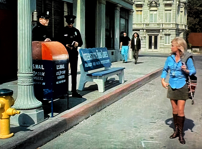 Don’t you just love it when you notice something that shouldn’t be in a particular shot – like the chalk mark indicating a camera position?  Look to the lower right of this frame from Season 2, Episode 2 of the old NBC series, Adam 12.  I’m really not that obsessive…but when I saw it, I couldn’t help passing it along.