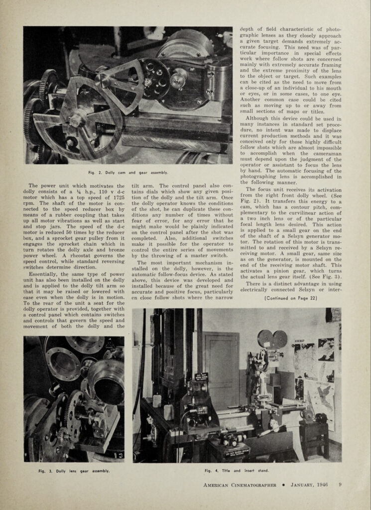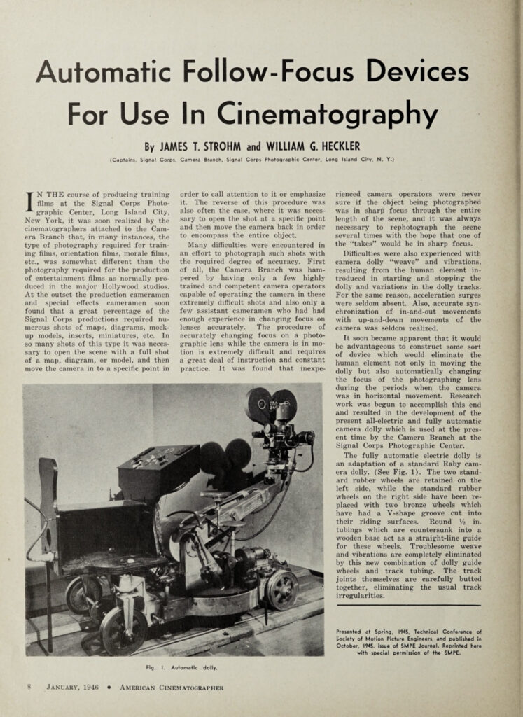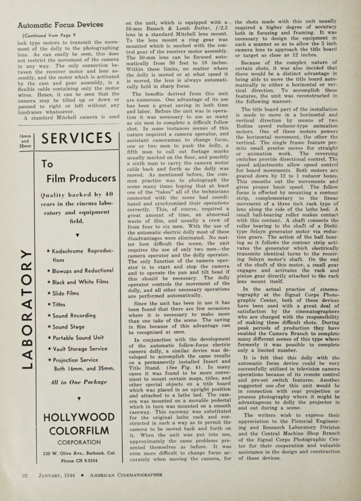 This article, found in the January 1946 issue of American Cinematographer, addresses the design and build of an automatic follow focus device for use with motion picture cameras. As a creation of its time, the story of this Rube Goldberg-like machine is an interesting one. Though this capability has long been a standard part of the stills world, the idea never caught on with Hollywood. The choice of where and when to place focus in a moving image is too important a creative tool to be left to the roamings of a dispassionate algorithm.