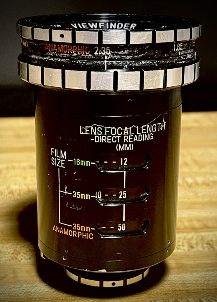 Operation couldn’t be simpler: First, rotate the appropriate part of the barrel to choose a format (16mm or 35mm), aspect ratio (2.35, 1.85, 1.66, TV safe and 1.33) and focal length.  Then, hold it up to your eye and frame away.  It was great for clarifying your thoughts and anticipating problems, as well as giving the director an idea of what to expect during those days when the quality of video assist was still a bit dodgy.