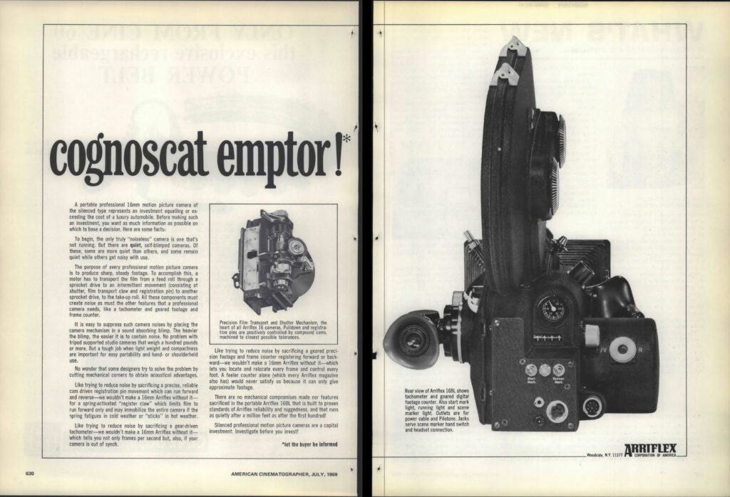 In light of my recent fascination with Eclair’s 1960’s-vintage ads, here’s a little love for our good friends at Arriflex. While not as stylish or clever as the French offerings, Arri is the only camera manufacturer I’m aware of to start their sales pitch with a Latin phrase. Its meaning? Let the buyer be informed.