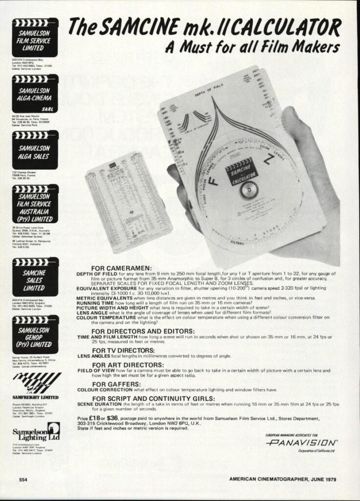 Speaking of which, notice the headings suggesting uses of the Samcine Calculator in the ad: For Cameramen and For Script and Continuity Girls. Thankfully, the technology isn’t the only thing that has changed since 1979…