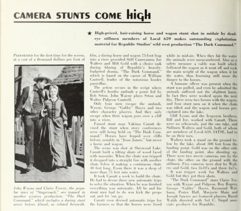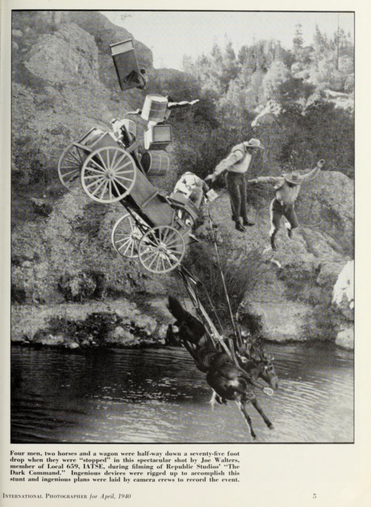 Before watching the clip, read the background on this crazy stunt from Raoul Walsh’s 1940 western, Dark Command (shot by Jack Marta). It’s drawn from the April 1940 edition of International Photographer, which was the long-time house organ of the cinematographers’ union, IATSE Local 659 (forerunner of today’s Local 600). Now published as ICG Magazine, it does a good job of covering our side of things, but you’ll never see anything like this grace its pages again!