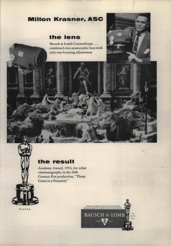As the Oscar attests, Krasner certainly figured out how to optimize his tools. So much so that he appeared in a March 1956 American Cinematographer ad on behalf of Bausch & Lomb. The other photos you see below are from the ASC’s collection. Who knows? That very lens might have been part of Krasner’s Three Coins set! (Note well: the front element has been removed for safe keeping while in storage)