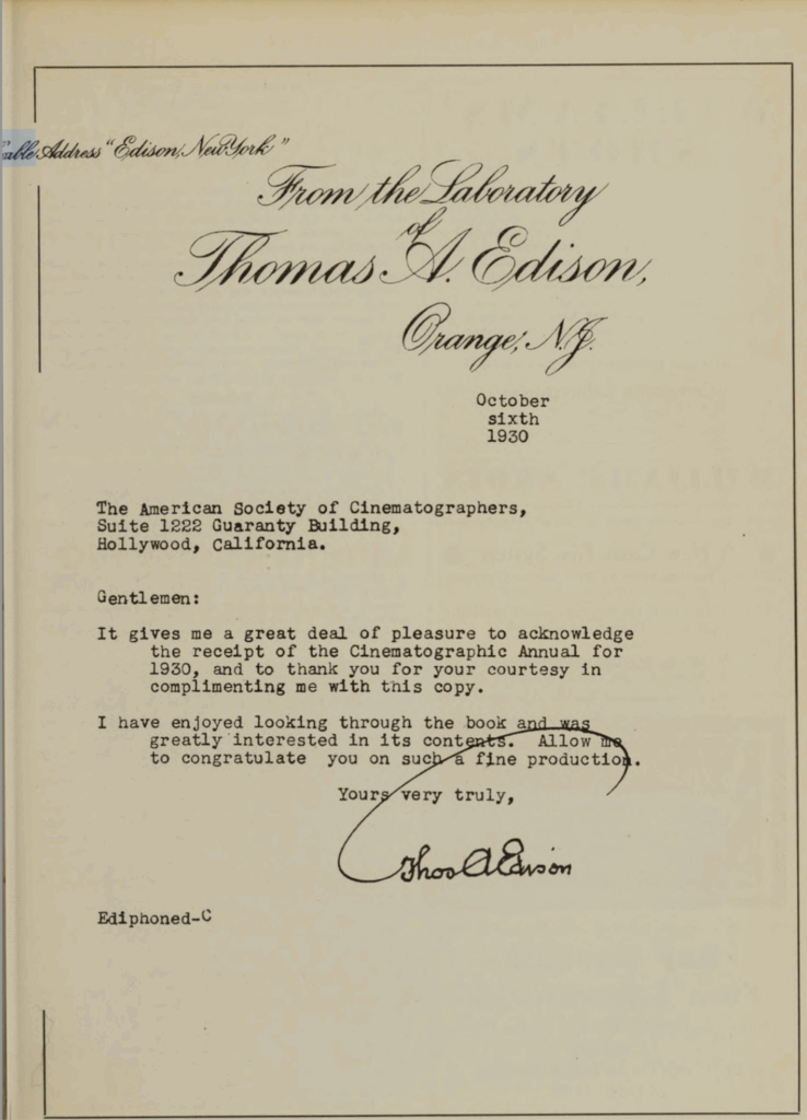 On the tail of Friday’s post regarding the Cinematographic Annual, a deep-dive into the ASC archive unearthed the amazing document you see below. In addition to the 2,332 patents Thomas Edison was granted during his career, he is universally acknowledged as one of the creators of the motion picture camera. In the letter, his polite way with words is charming as it recalls a more civil period in our culture.