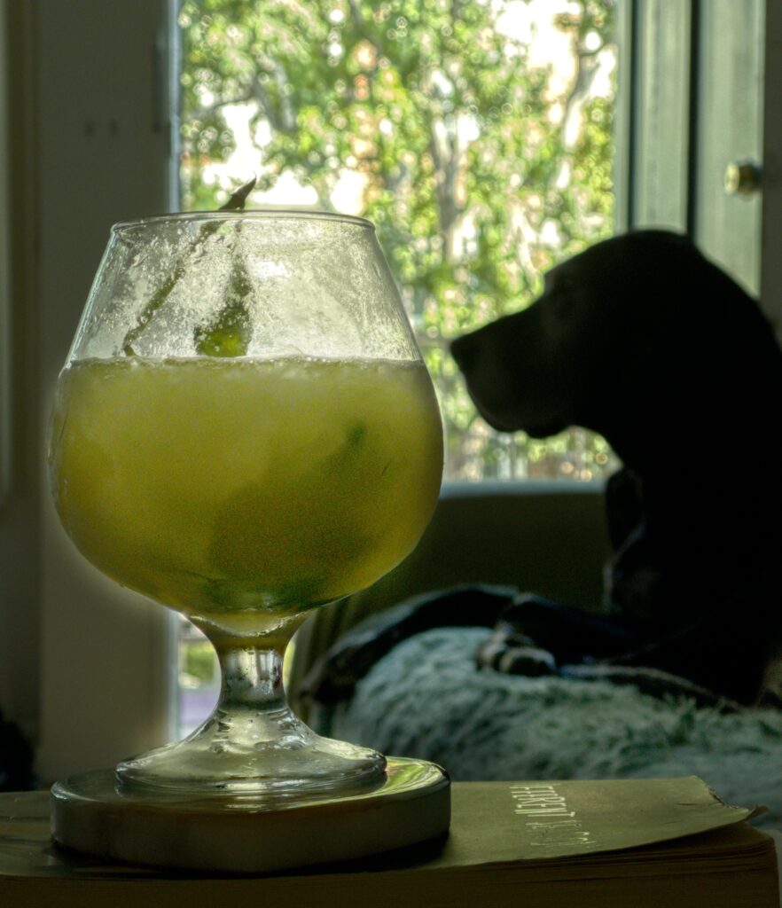 What a great shot with the cool drink, your buddy, and the trees beyond!